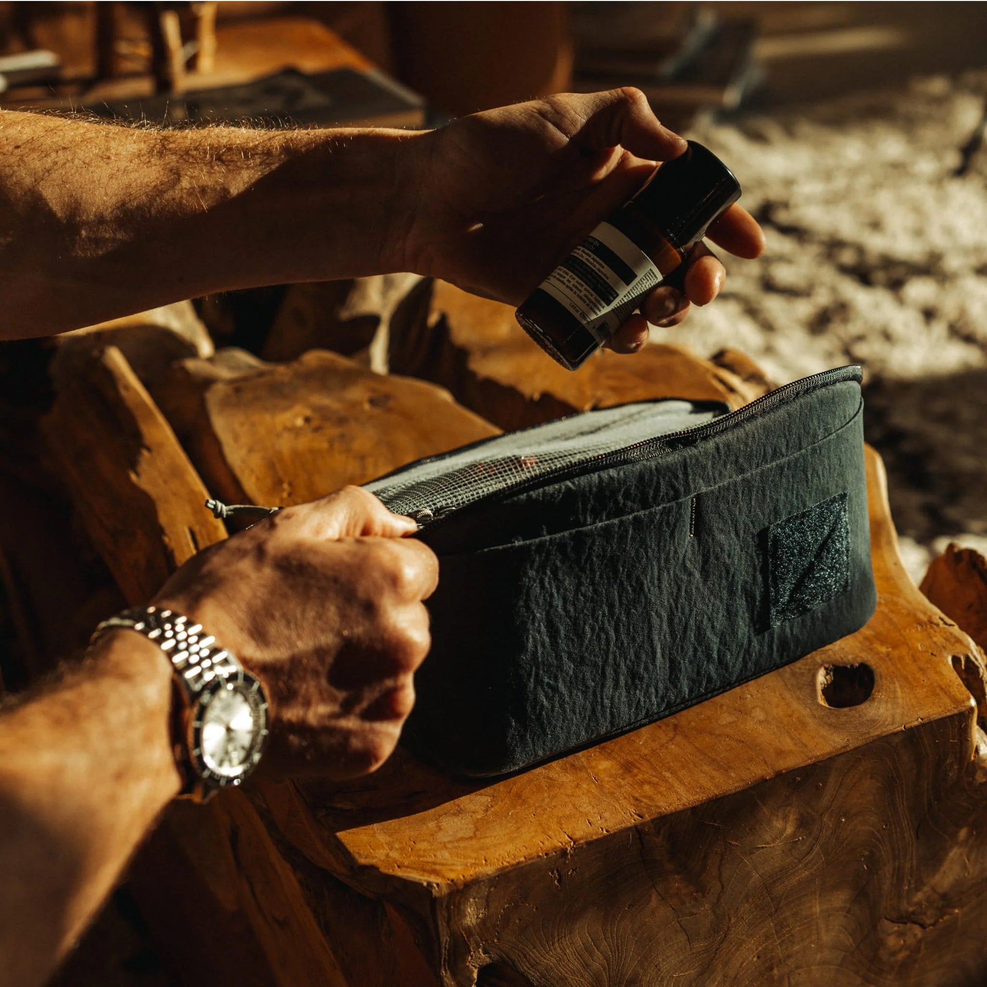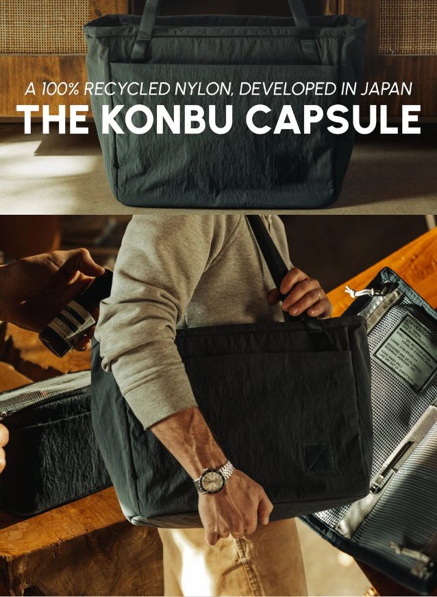 Developed in Japan, Konbu is a 100% recycled nylon textile. Through a proprietary process, each fiber is swollen and compressed to create a dense, structured fabric with a crisp, dry hand feel and a distinctive and uniform crepe texture. The result is a refined and distinct material that holds its shape, with a matte finish and subtle depth reminiscent of the texture and character of deep water seaweed.