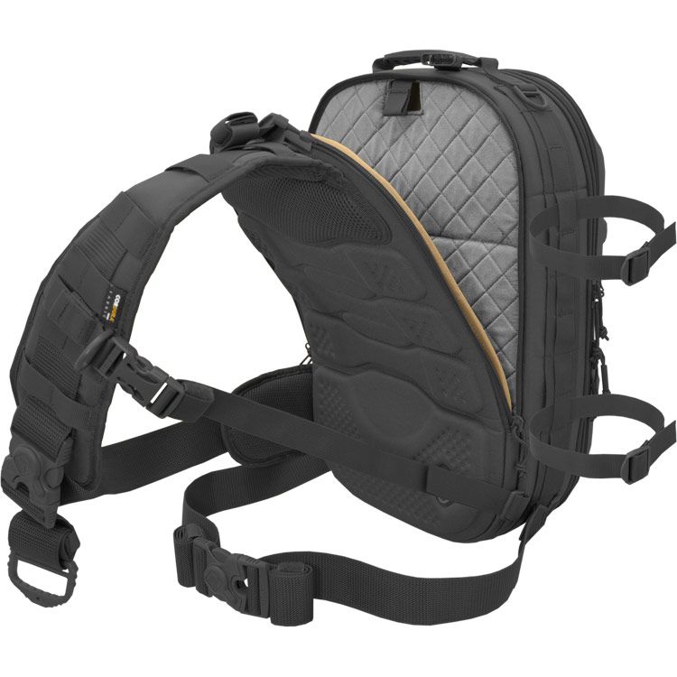 Molded-foam and 360° padded walls protect gear, and support load mounts. The sling configuration allows sliding from back to chest for fast access. Open it all the way up or just from the side-hatch designed for primary camera access while on the chest or sitting sideways. The first pack of its kind to also feature a waist belt to hold heavy loads while allowing sling use as well. Modular padding dividers accommodate cameras, DJI drones, various optics, and electronics, etc. for demanding users like press, travel vloggers, military/agencies, etc. The aesthetics project a progressive technology image for professional use and client work. Padded flat compartments are provided to fit a 16” pc/mac laptop, and a separate tablet. An organization panel hosts accessories like card-readers, sd cards, pens, etc. Personal items like snacks, rain shell, or first aid kits fit into the top shell section; These items are often not allotted for on most photo/digital type packs, but are important since the users are often on their own and outdoors for extended time. The top shell has 6 spots for our patented Hardpoint® parts allowing optional attachment of loops, lights, bungee systems, MOLLE panels, etc. This pack is also very suitable for motorcycle use as it won't flap in the wind. The molded back-pad is abrasion resistant while conforming to the spine and ventilating sweat. Military modular webbing (MOLLE) is provided throughout on the sides and strap, while the interior is lined with fuzzy tricot for expansion with pouches, velcro i.d. patches, etc. YKK® Zippers, real Cordura® 1000D nylon (Scorpion model is similar 600D Polyester) and reinforcing stitch patterns ensure lasting quality. Our patented locking roto-buckle is used on the main strap, as is our patented photo-d-ring which allows mounting of ¼-20” screw equipment like cameras as a leash. ¼-20” screw ports are also provided on the hard-MOLLE polymer strips to add lighting, grips, etc. See the details below for the full feature set.