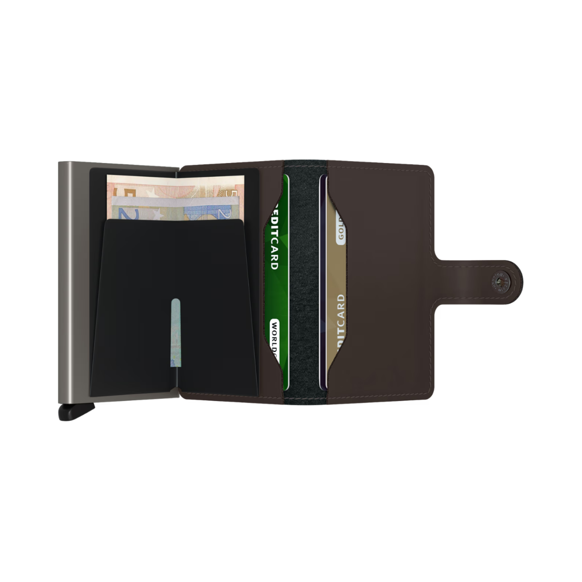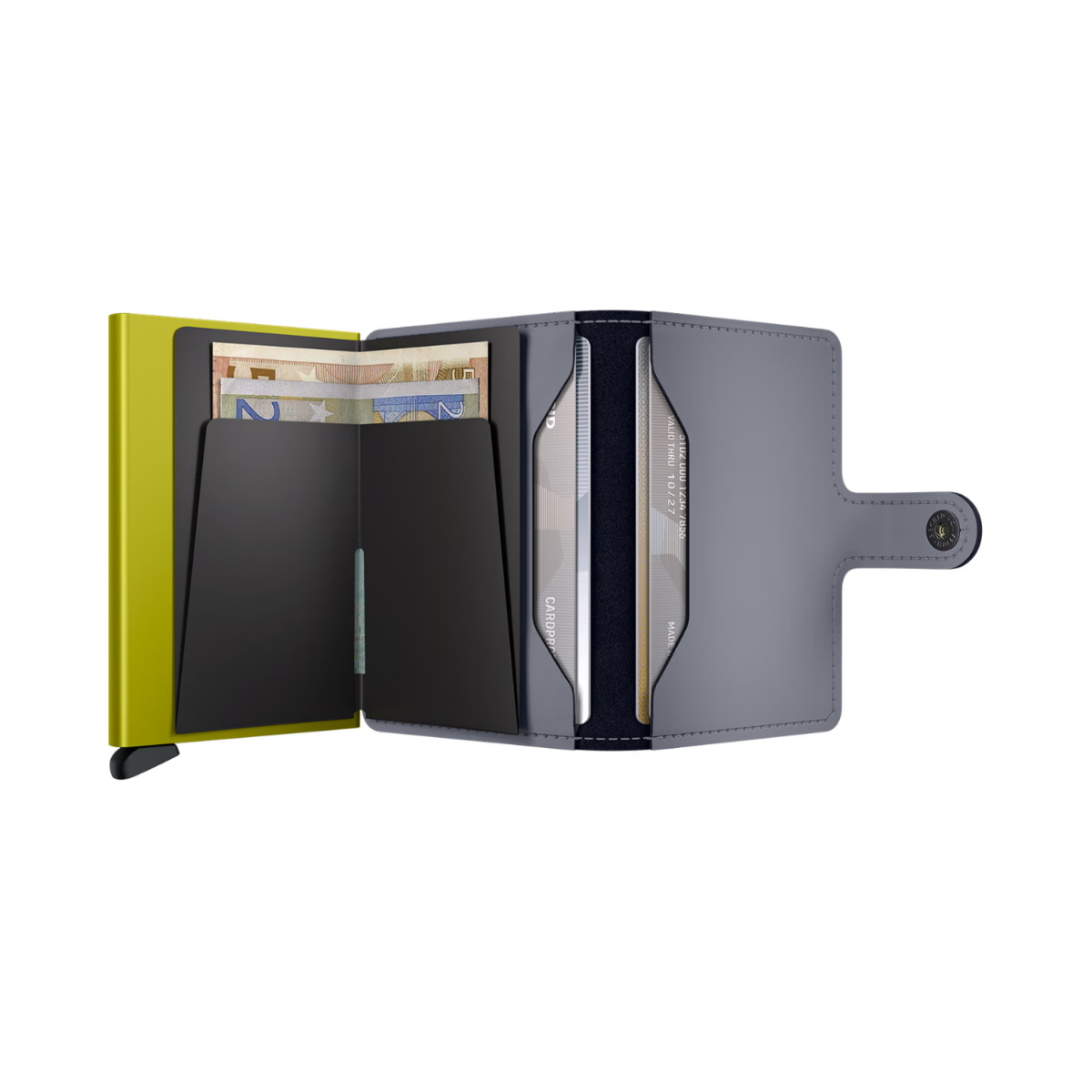 Small in size and surprisingly large in storage capacity, the Miniwallet combines the best of both worlds. The exterior holds banknotes, receipt and cards, while the aluminium Cardprotector allows you to slide out cards with one simple motion and protects them from bending, breaking and unwanted wireless communication.